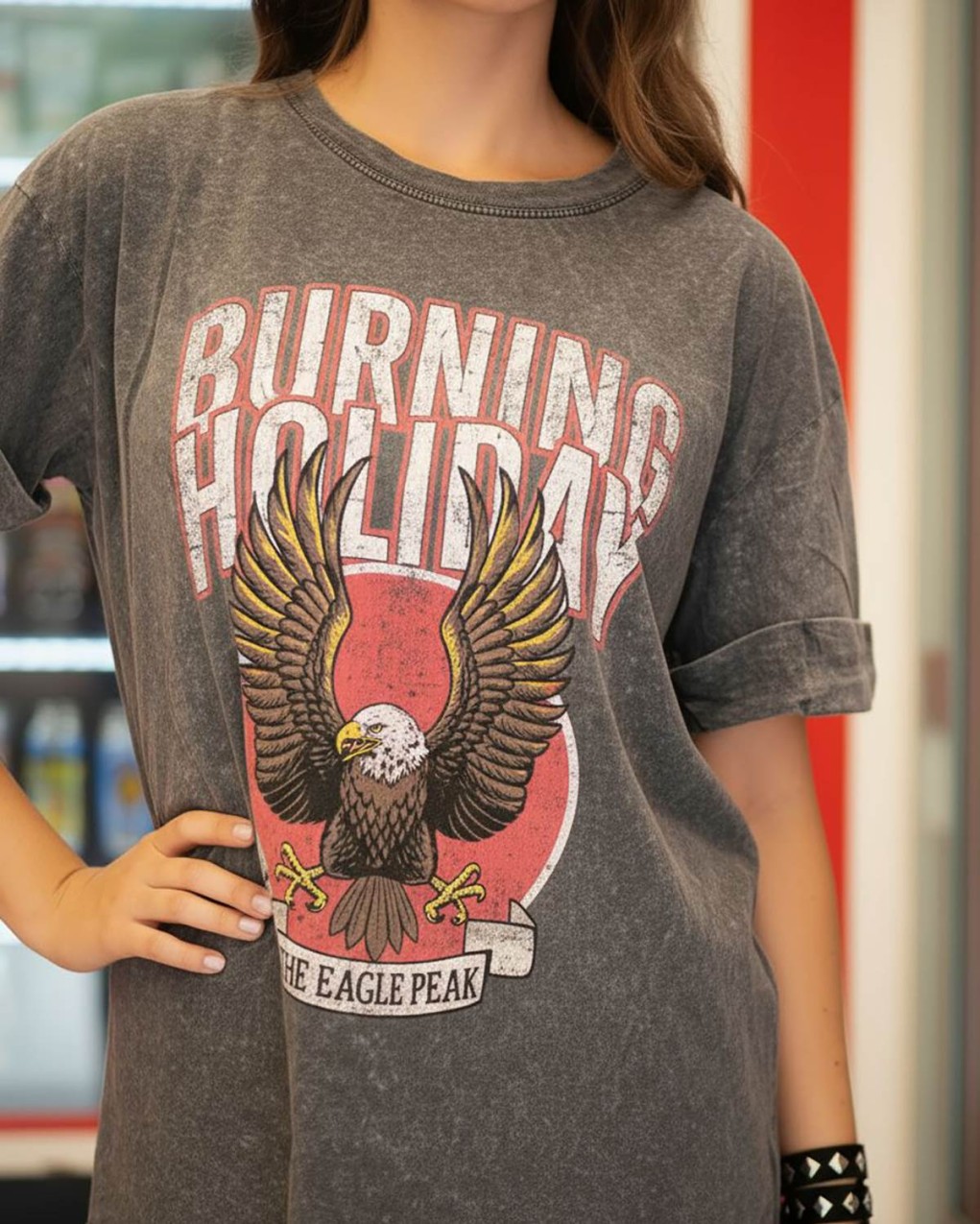 T-shirt vintage in stile rock con stampa grafica "Burning Holiday" e aquila in evidenza. Realizzata in morbido cotone con effetto stone washed per un look vissuto e autentico. Il taglio oversize offre una vestibilità comoda e versatile, perfetta per uno stile urban casual. (bandana non inclusa)