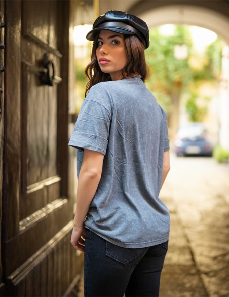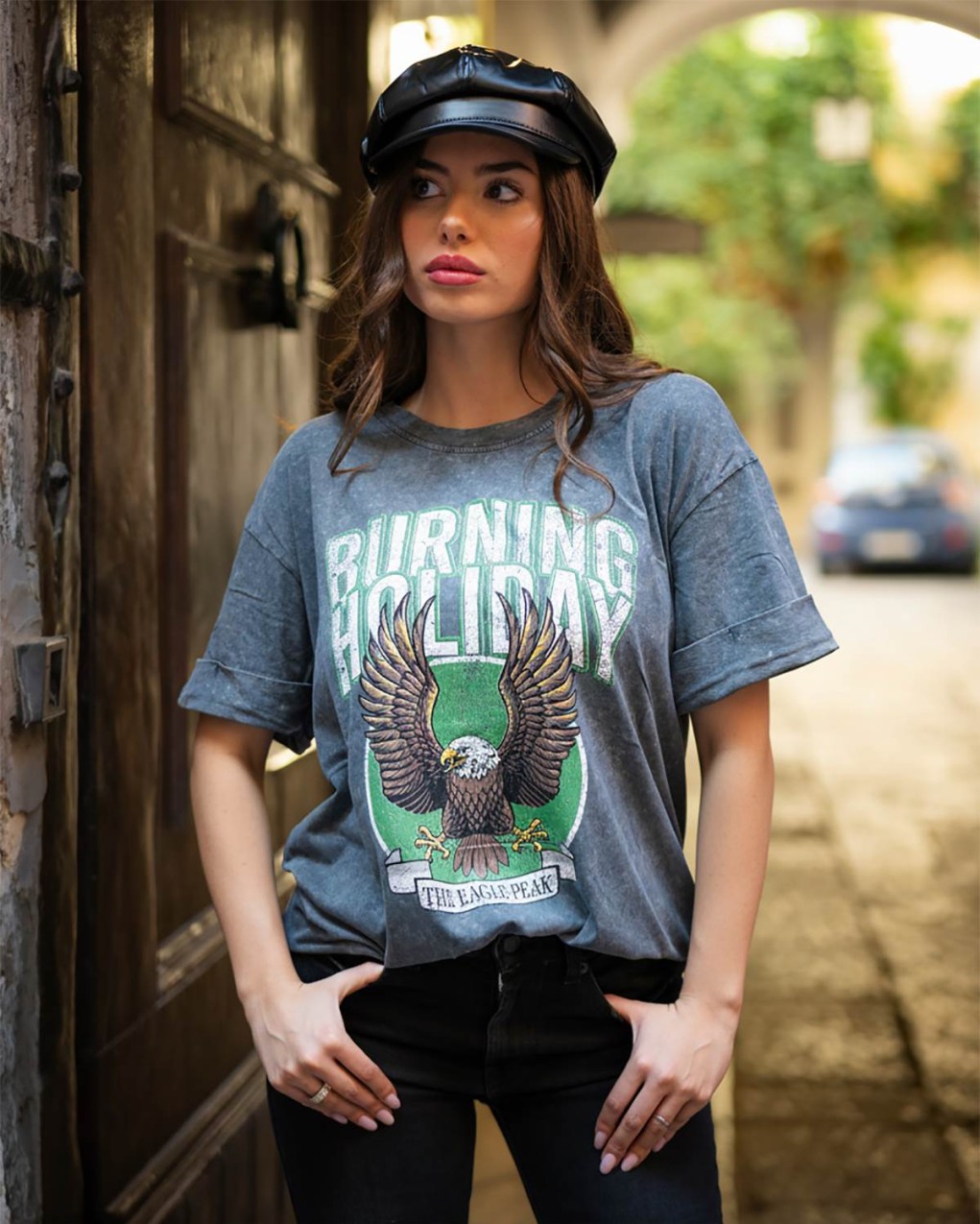 T-shirt vintage in stile rock con stampa grafica "Burning Holiday" e aquila in evidenza. Realizzata in morbido cotone con effetto stone washed per un look vissuto e autentico. Il taglio oversize offre una vestibilità comoda e versatile, perfetta per uno stile urban casual. (bandana non inclusa)