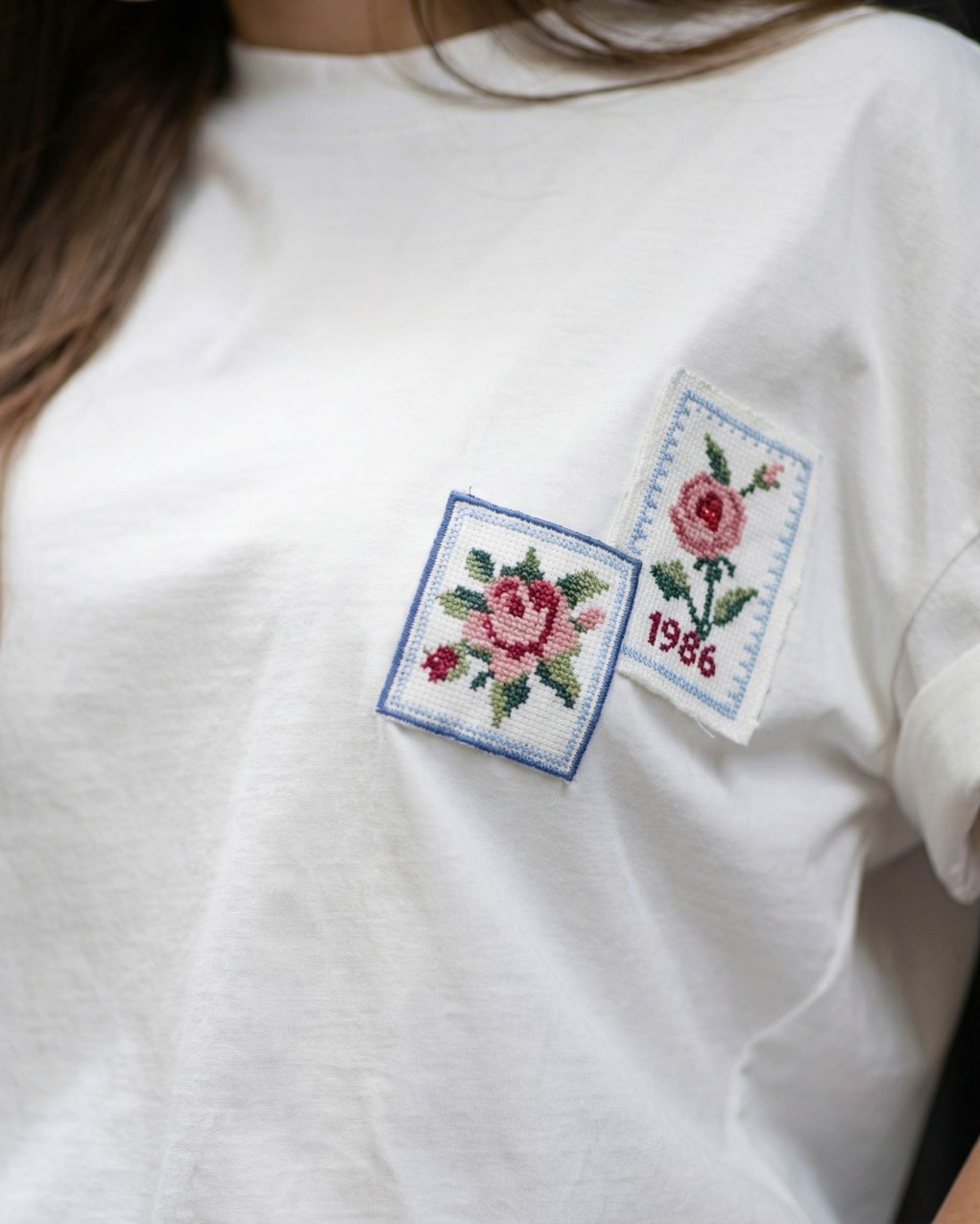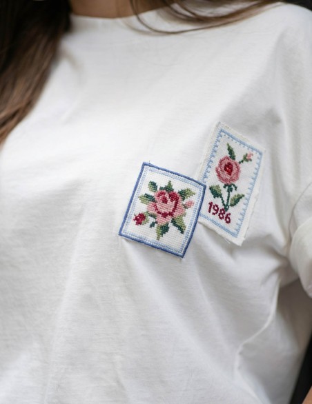 T-shirt donna dallo stile casual contemporaneo, caratterizzata da eleganti applicazioni floreali ricamate sul petto che donano un tocco romantico e distintivo. Realizzata in morbido cotone confortevole, presenta maniche corte con risvolto e girocollo classico. La vestibilità è regular fit e leggermente oversize, ideale per look quotidiani versatili e femminili.
