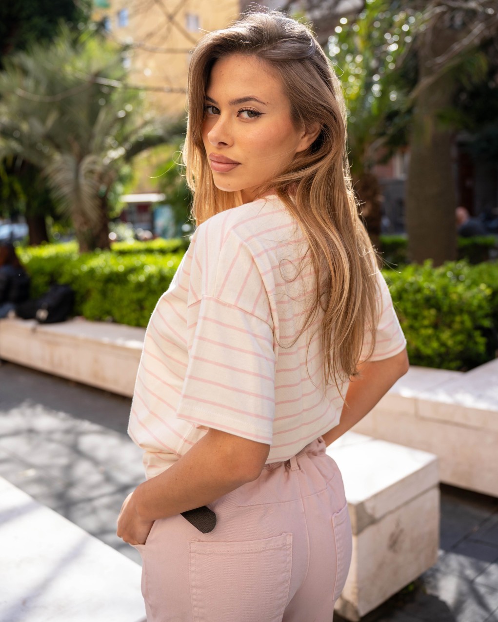 T-shirt donna dallo stile casual-chic, caratterizzata da un elegante motivo a righe orizzontali. Realizzata in morbido tessuto jersey, presenta maniche corte, girocollo con finitura a costine e vestibilità comoda e rilassata. Il design versatile e senza tempo la rende perfetta per outfit quotidiani sia casual che semi-eleganti, abbinabile facilmente a pantaloni, gonne e jeans.