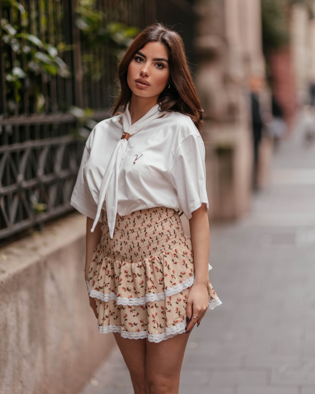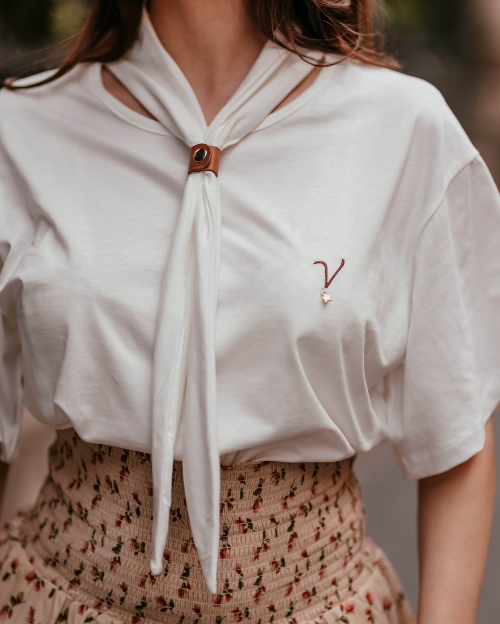 tshirt e a maniche corte dallo stile elegante e raffinato, caratterizzata da un dettaglio a foulard annodato al collo con applicazione metallica decorativa. Realizzata in tessuto leggero e fluido, ideale per la stagione estiva o per occasioni semi-formali. La vestibilità è regolare e confortevole, con lunghezza standard che si abbina perfettamente a pantaloni o gonne. Il design minimal è impreziosito dal piccolo logo ricamato sul petto.