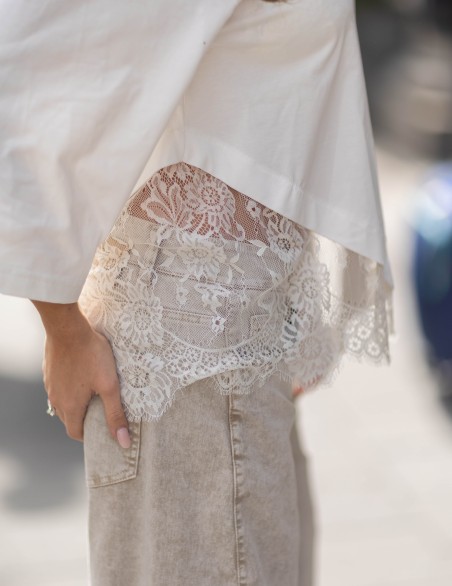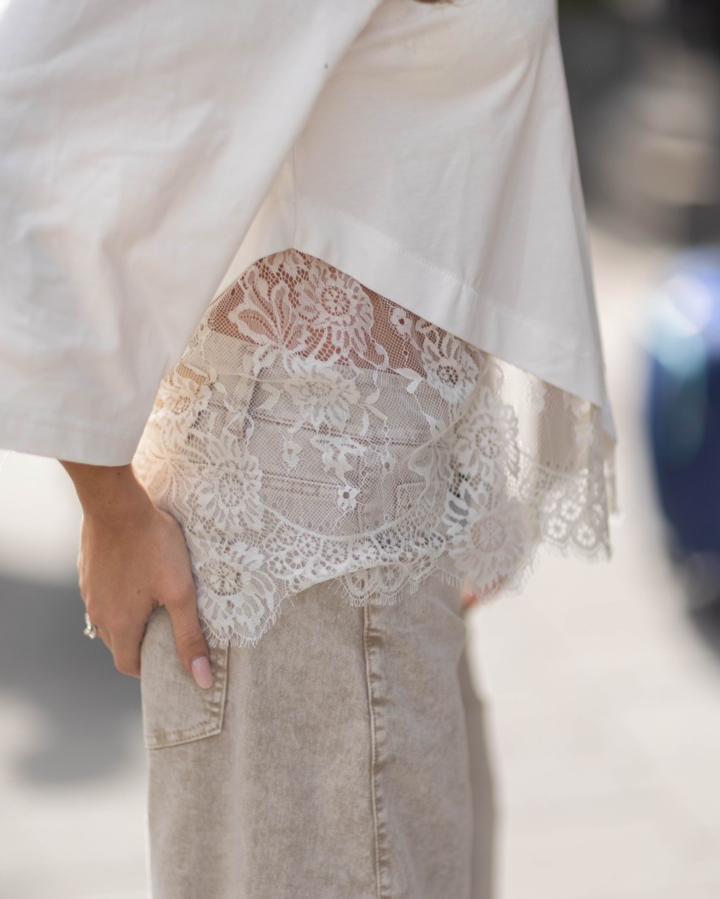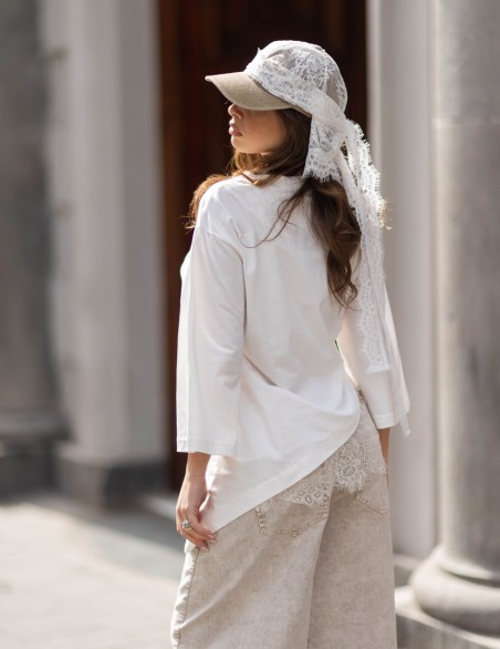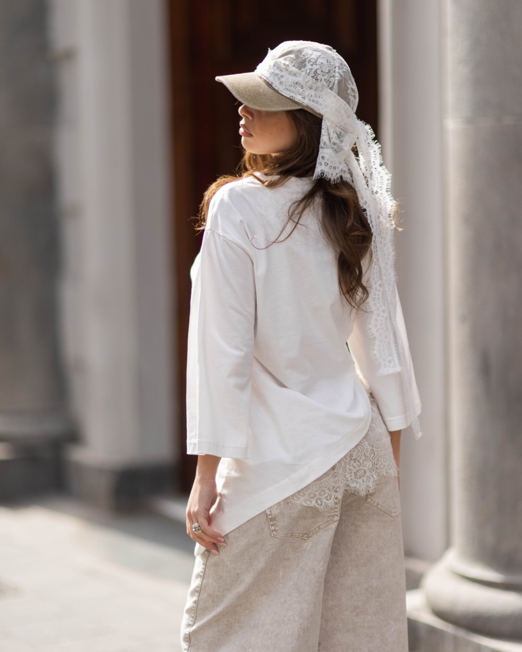 Maglietta oversize dallo stile contemporaneo con dettaglio distintivo in pizzo sul fondo che crea un elegante contrasto tra casual e raffinato. Realizzata in morbido cotone, presenta maniche a tre quarti e girocollo classico per un comfort ottimale. La vestibilità ampia e rilassata garantisce massima libertà di movimento, perfetta per un look urbano e sofisticato. Un capo versatile che unisce la praticità dello streetwear alla femminilità dei dettagli ricercati.
