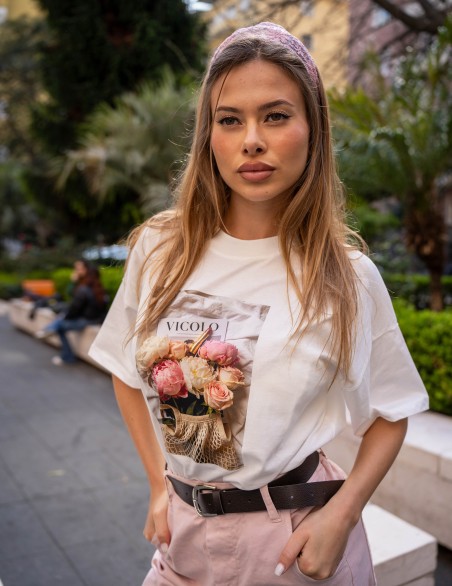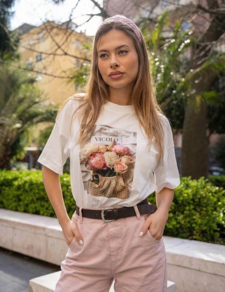 T-shirt donna dallo stile contemporaneo con stampa grafica floreale di grande impatto. Realizzata in morbido cotone di qualità, presenta girocollo classico e maniche corte per un comfort ottimale. La vestibilità regolare si adatta perfettamente a look casual o semi-formali, ideale da abbinare con pantaloni sartoriali o jeans. Capo versatile che unisce eleganza e praticità per un guardaroba moderno e ricercato.