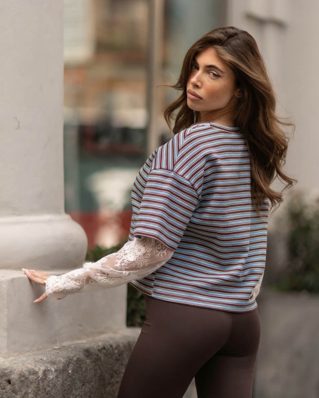 T-shirt casual a righe con design innovativo a doppio strato. Caratterizzata da maniche corte in maglia rigata sovrapposte a maniche lunghe in pizzo sangallo trasparente, per un look contemporaneo e femminile. Realizzata in morbido cotone jersey con inserti in pizzo delicato. Vestibilità comoda e rilassata, lunghezza corta che valorizza la silhouette, ideale per outfit casual-chic e stratificazioni creative.