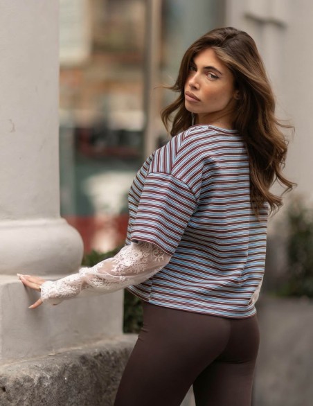T-shirt casual a righe con design innovativo a doppio strato. Caratterizzata da maniche corte in maglia rigata sovrapposte a maniche lunghe in pizzo sangallo trasparente, per un look contemporaneo e femminile. Realizzata in morbido cotone jersey con inserti in pizzo delicato. Vestibilità comoda e rilassata, lunghezza corta che valorizza la silhouette, ideale per outfit casual-chic e stratificazioni creative.