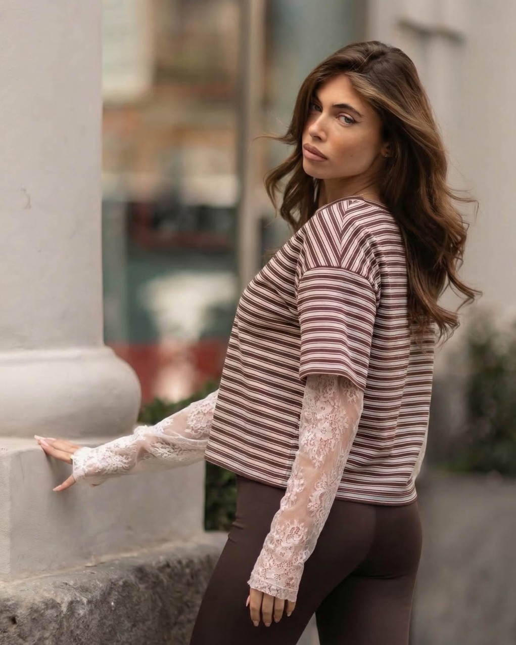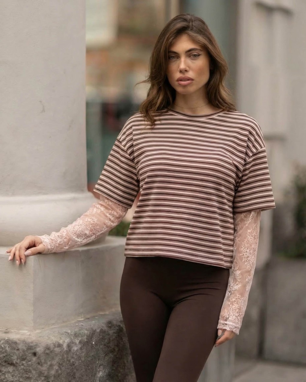 T-shirt casual a righe con design innovativo a doppio strato. Caratterizzata da maniche corte in maglia rigata sovrapposte a maniche lunghe in pizzo sangallo trasparente, per un look contemporaneo e femminile. Realizzata in morbido cotone jersey con inserti in pizzo delicato. Vestibilità comoda e rilassata, lunghezza corta che valorizza la silhouette, ideale per outfit casual-chic e stratificazioni creative.
