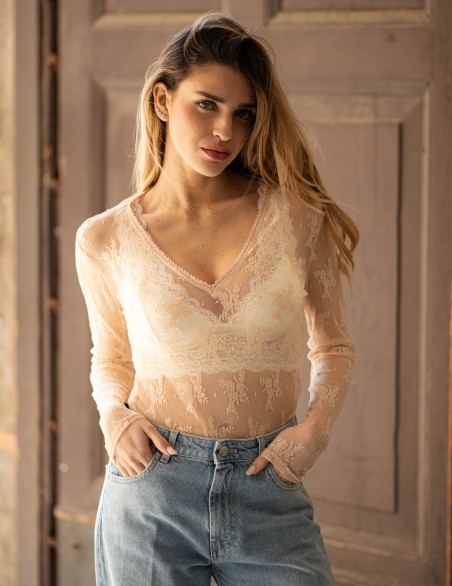 Top femminile in pizzo trasparente dallo stile romantico e ricercato, perfetto per occasioni speciali o serate eleganti. Realizzato in delicato tessuto di pizzo con ricami floreali, presenta una scollatura a V e maniche lunghe aderenti. La vestibilità è aderente e valorizzante, con effetto semi-trasparente che crea un look sofisticato e sensuale. Ideale da abbinare a pantaloni a vita alta o gonne per un outfit contemporaneo e femminile.