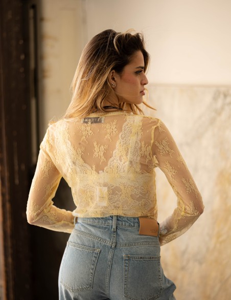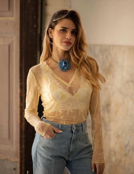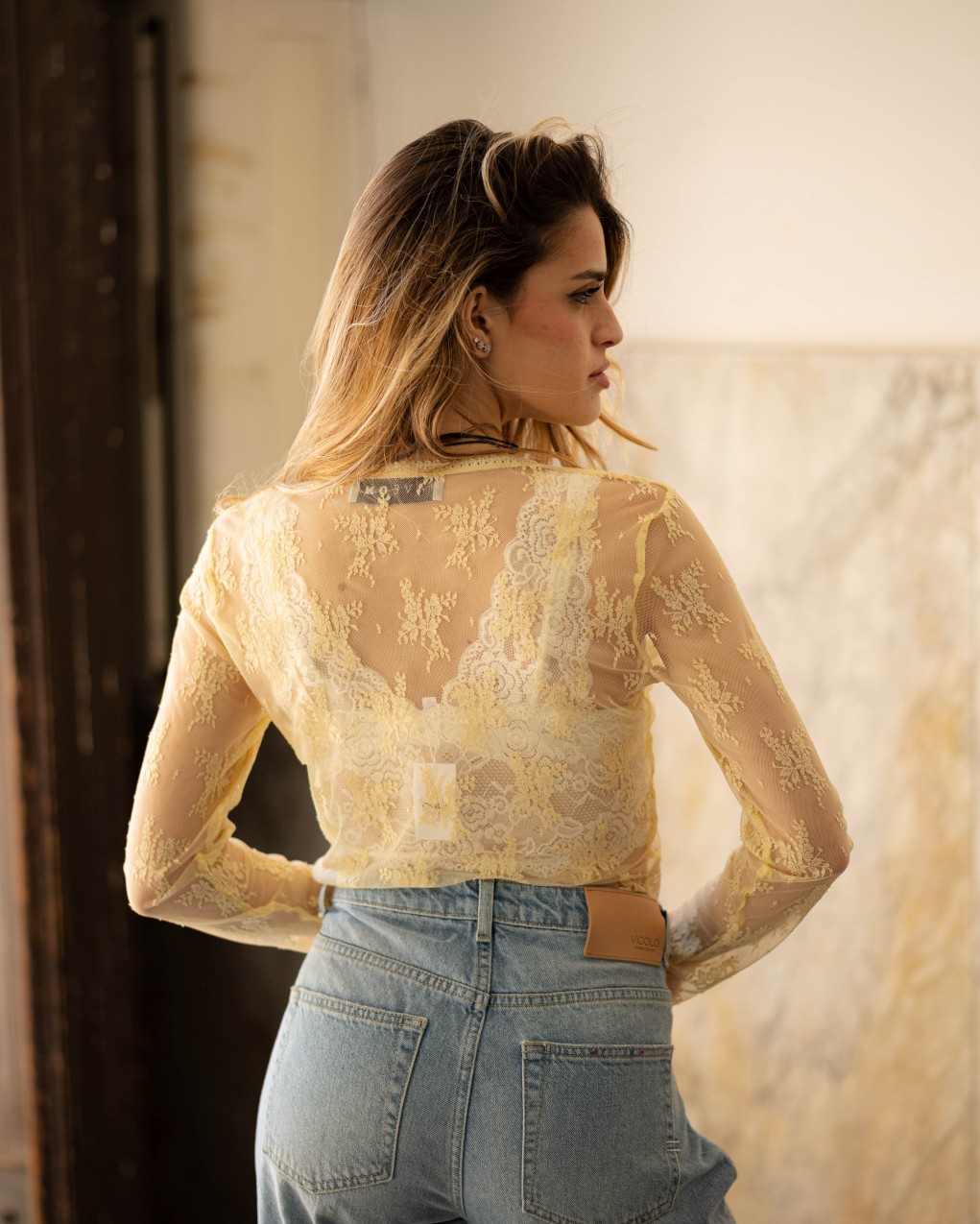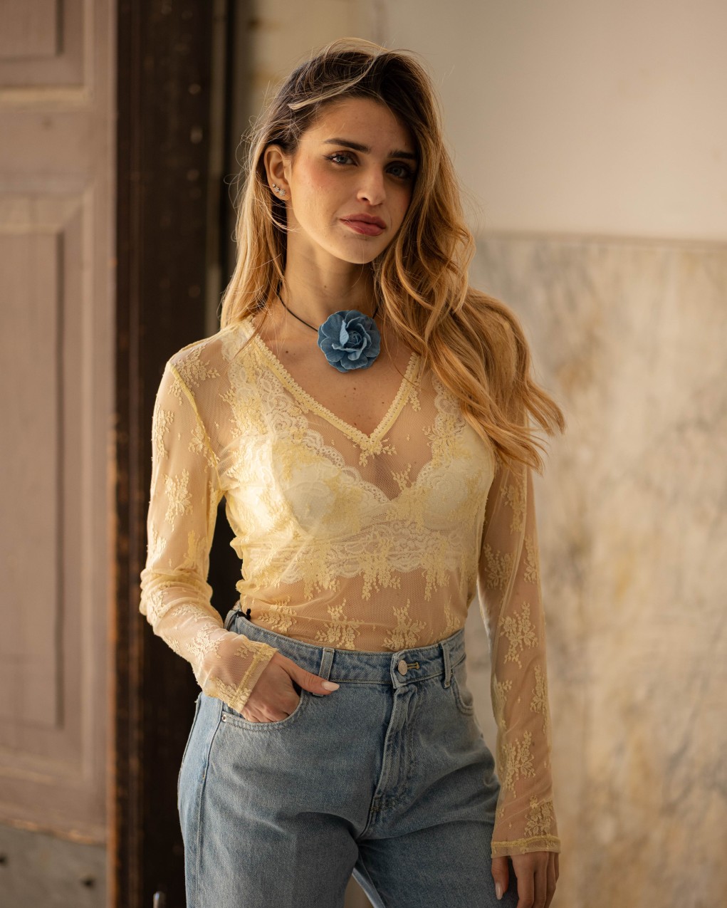 Top femminile in pizzo trasparente dallo stile romantico e ricercato, perfetto per occasioni speciali o serate eleganti. Realizzato in delicato tessuto di pizzo con ricami floreali, presenta una scollatura a V e maniche lunghe aderenti. La vestibilità è aderente e valorizzante, con effetto semi-trasparente che crea un look sofisticato e sensuale. Ideale da abbinare a pantaloni a vita alta o gonne per un outfit contemporaneo e femminile.