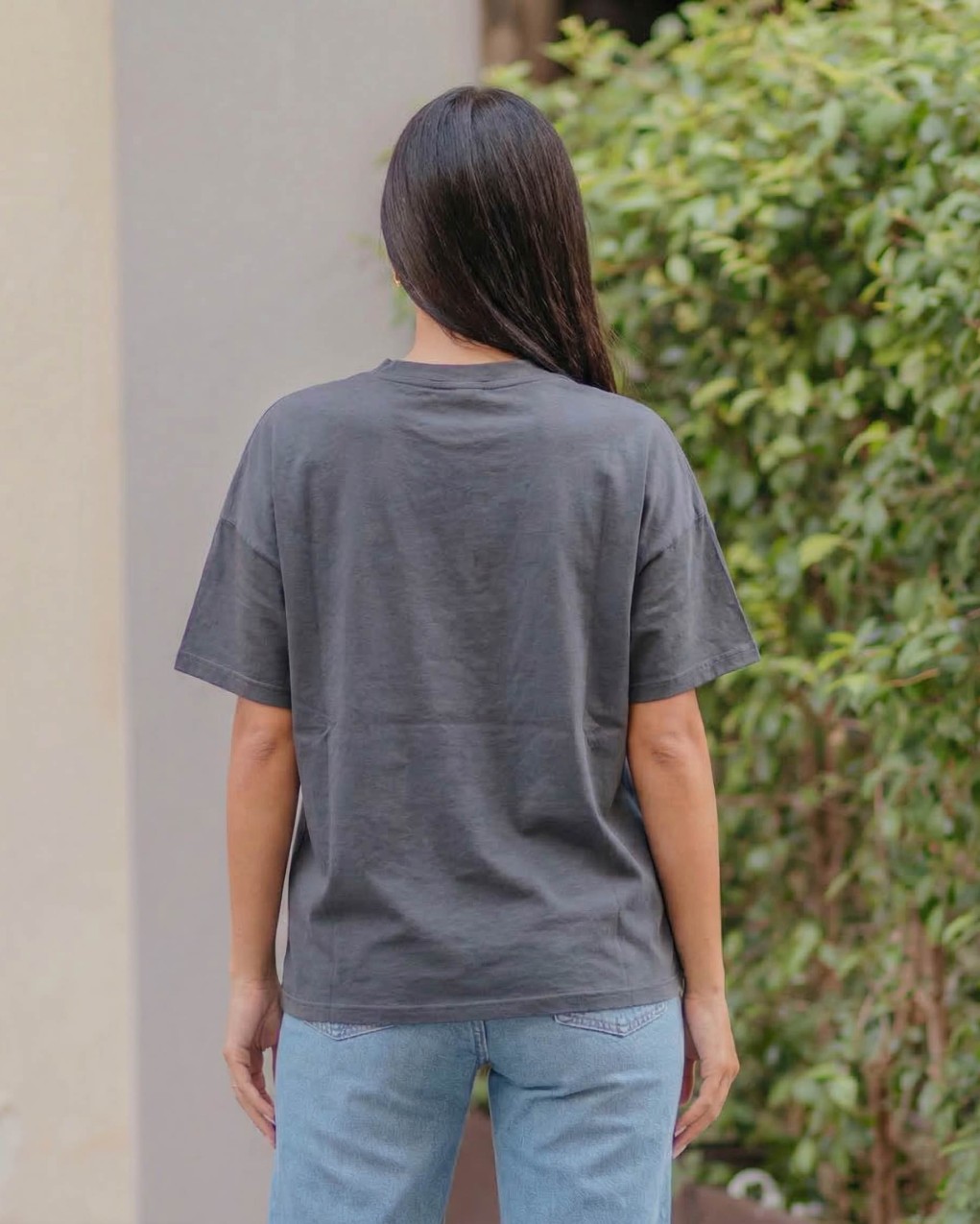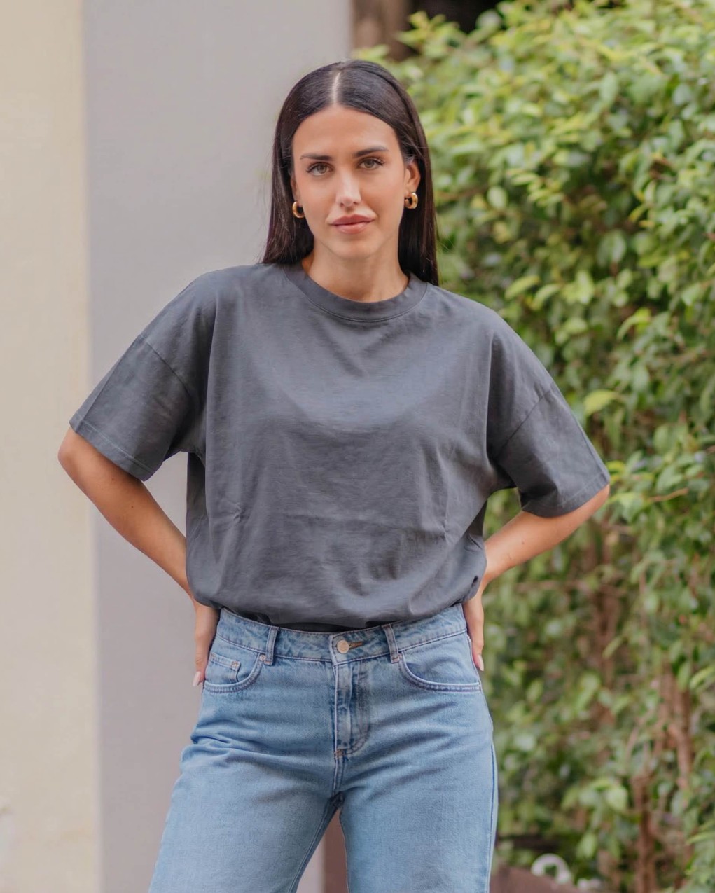 T-shirt oversize da donna dallo stile casual e contemporaneo, caratterizzata da una silhouette ampia e rilassata. Realizzata in morbido cotone jersey, presenta girocollo classico e maniche corte ampie per il massimo comfort. La vestibilità oversized offre un look moderno e versatile, perfetta da abbinare a jeans o pantaloni per outfit quotidiani informali ma curati.