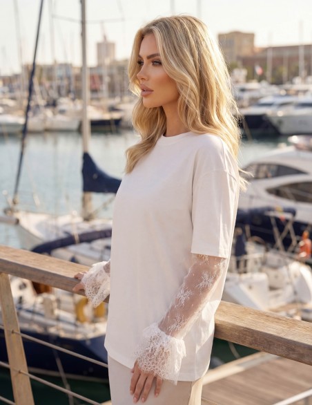 tshirt Modello girocollo a mezza manica. Dettaglio di manica e polsino volant in pizzo. Fit regolare.