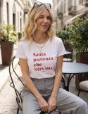 T-shirt donna dallo stile casual e ironico, caratterizzata da una stampa con scritta italiana dal tono scherzoso e diretto. Realizzata in morbido cotone traspirante, offre comfort per l'uso quotidiano. Presenta girocollo classico e maniche corte, con vestibilità regular che si adatta perfettamente a look informali e rilassati. Ideale per chi cerca un capo basic con personalità.