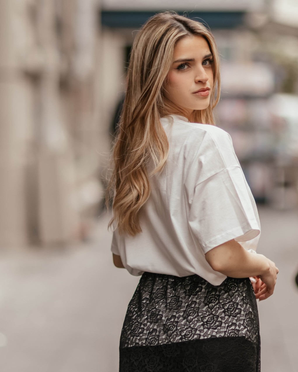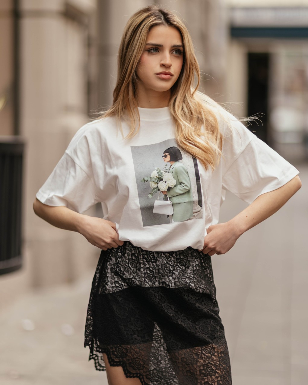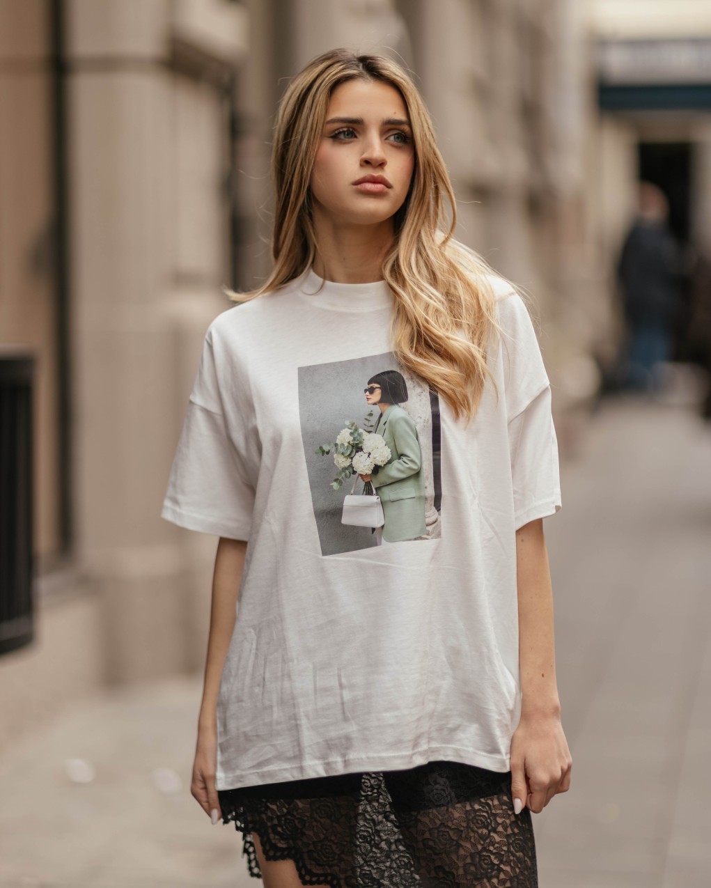 T-shirt dallo stile urban contemporaneo caratterizzata da una stampa fotografica artistica frontale che dona personalità al capo. Realizzata in morbido cotone, presenta una vestibilità oversize con maniche corte ampie e girocollo classico, perfetta per un look casual-chic. Il design rilassato e la lunghezza media la rendono ideale da abbinare a gonne, pantaloni o leggings per outfit quotidiani dal carattere deciso.