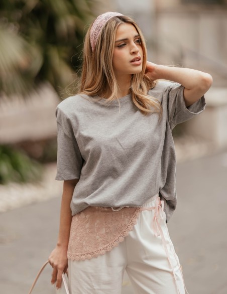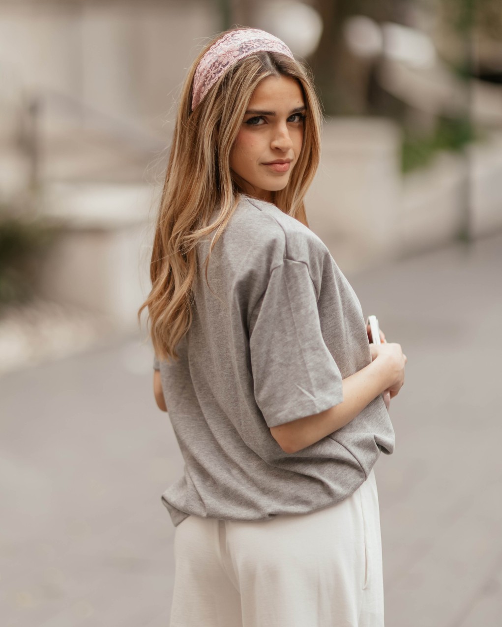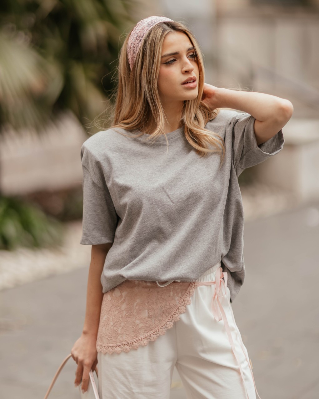 T-shirt oversize con spalline dallo stile casual e contemporaneo, perfetta per un look rilassato ma curato. Realizzata in morbido cotone jersey, presenta girocollo classico e maniche corte a lunghezza media per un comfort ottimale. La vestibilità è volutamente ampia e rilassata, ideale da indossare sia con capi basic che abbinata a pantaloni eleganti per un contrasto di stili. Capo versatile essenziale per il guardaroba quotidiano.
