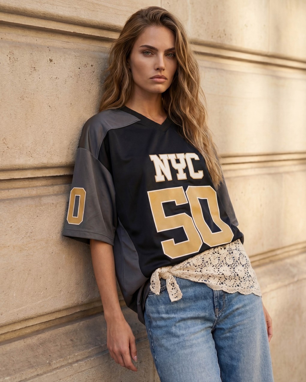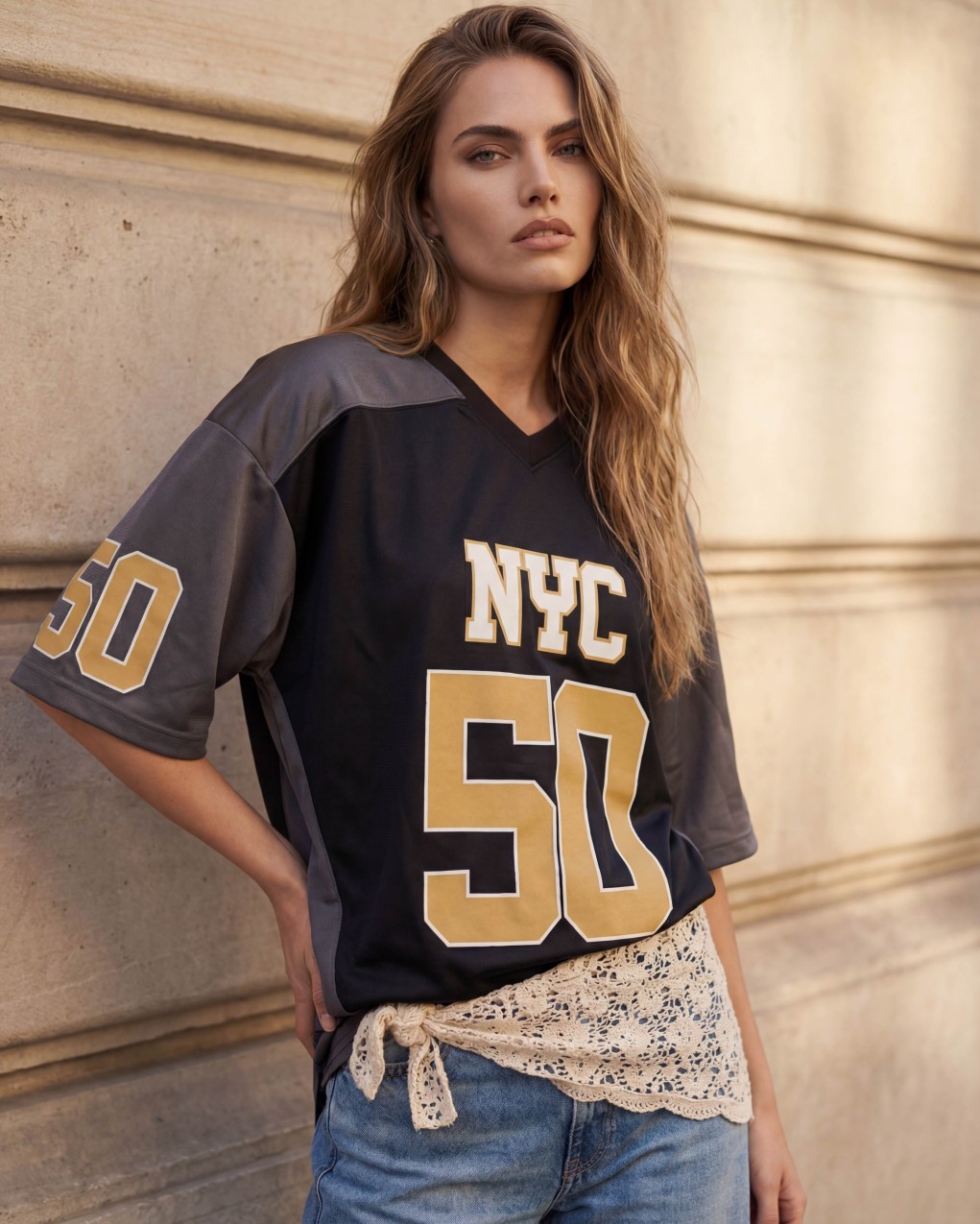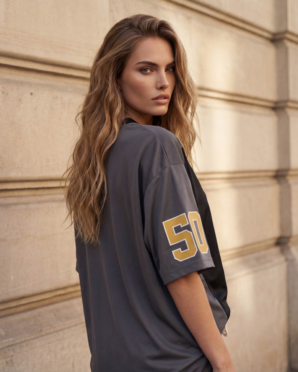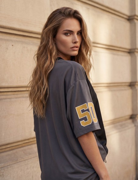 Maglia sportiva in stile baseball oversize con scollo a V e maniche a tre quarti. Il capo presenta stampe numeriche e grafiche in stile urban sportswear, realizzato in tessuto tecnico con inserti a contrasto sulle maniche. Vestibilità ampia e comoda, perfetta per un look casual e atletico contemporaneo. Ideale da indossare come maxishirt o abbinata a leggings e shorts.