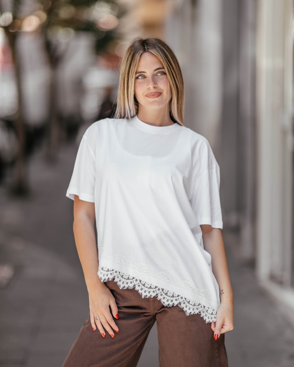 T-shirt donna dallo stile contemporaneo con dettaglio distintivo in pizzo sul bordo inferiore asimmetrico. Realizzata in morbido tessuto confortevole, presenta girocollo classico e maniche corte. La vestibilità è regolare e rilassata, perfetta per un look casual-chic che unisce praticità e femminilità. Il dettaglio in pizzo aggiunge un tocco raffinato al capo basic, rendendolo versatile per diverse occasioni.