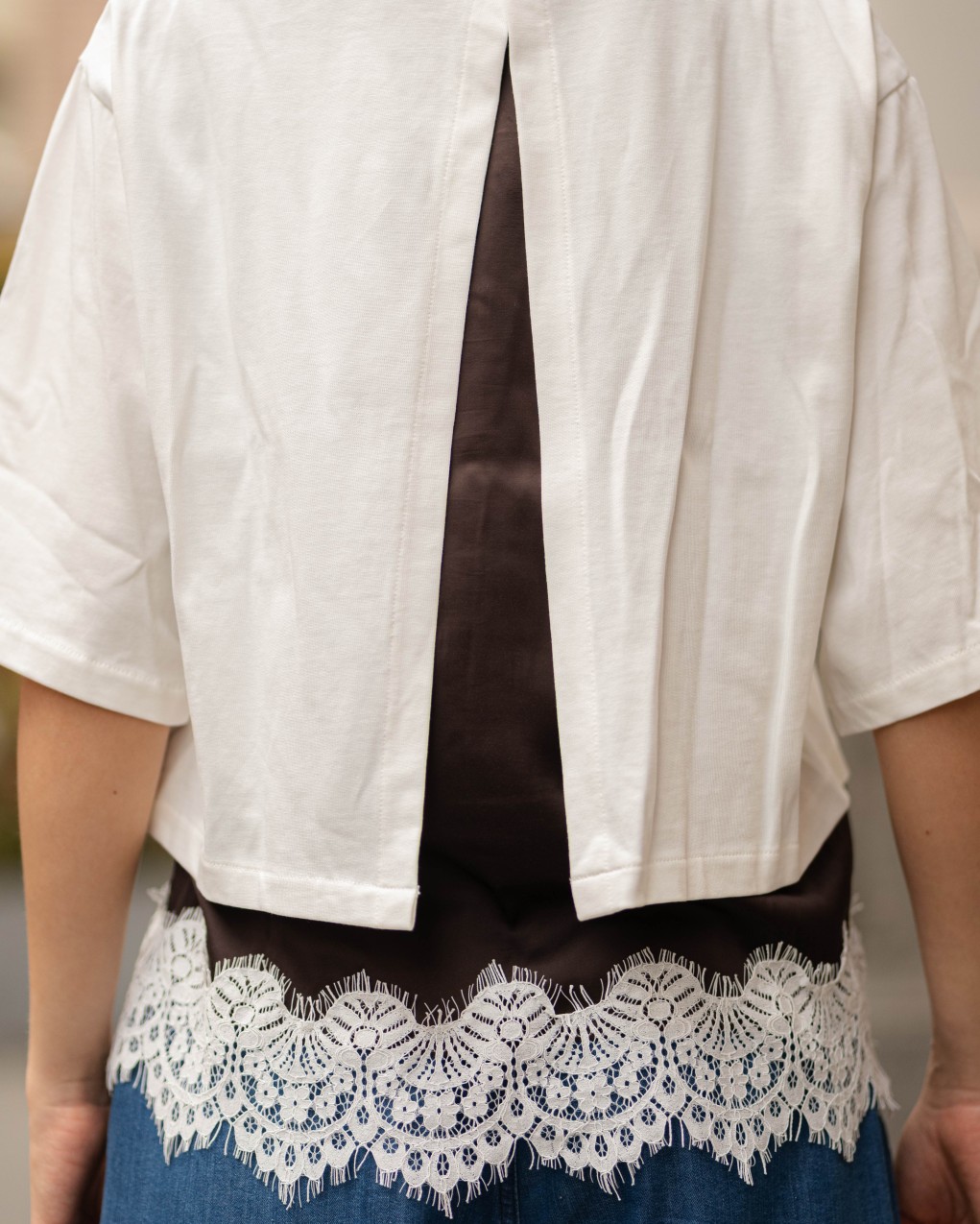 Maglia femminile a maniche corte dallo stile contemporaneo con elegante inserto in pizzo sul bordo inferiore. Realizzata in morbido tessuto stretch, presenta collo alto e vestibilità comoda e rilassata che la rende perfetta per look casual-chic. Il dettaglio prezioso in pizzo conferisce un tocco romantico e raffinato, trasformando un capo basic in un pezzo versatile adatto sia al quotidiano che a occasioni più ricercate.