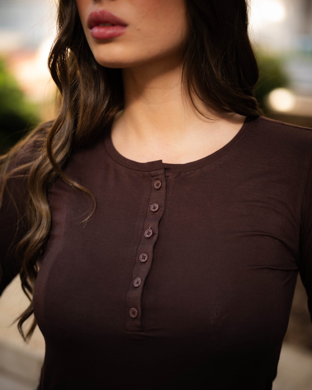 Elegante tshirt maniche lunghe realizzato in morbido tessuto elasticizzato, caratterizzato da una raffinata chiusura con bottoni sul décolleté. Il taglio aderente esalta la silhouette mentre garantisce massimo comfort grazie al tessuto stretch di alta qualità. Perfetto per essere abbinato a jeans e gonne, questo capo basic si distingue per la sua versatilità e vestibilità impeccabile.