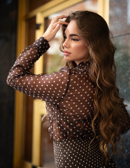 Elegante camicia a pois in morbido tessuto semitrasparente, perfetto per un look romantico e femminile. Il capo presenta maniche lunghe a sbuffo, colletto classico. La chiusura con bottoni sul davanti aggiunge un dettaglio raffinato.