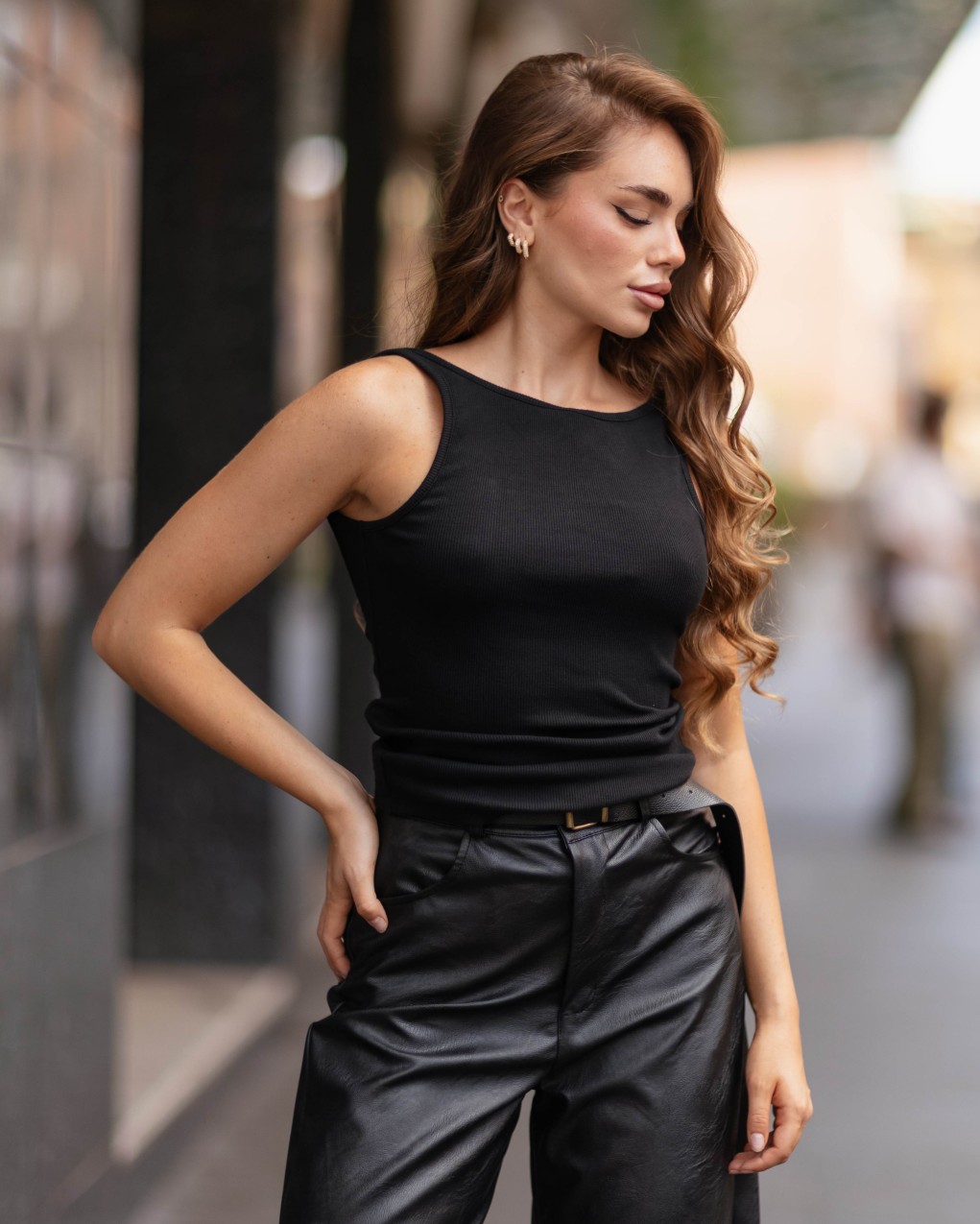 Canotta in tessuto a costine con scollo posteriore e linea aderente. Un capo versatile e minimal, perfetto per look casual o layering.