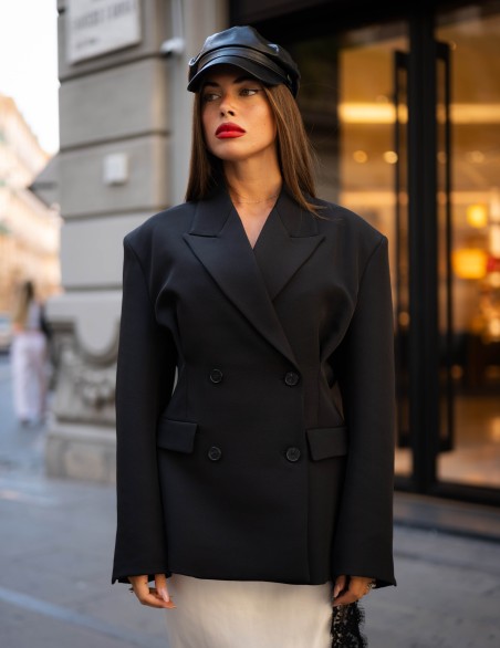 Elegante blazer sartoriale con design strutturato e dettaglio plissettato sul retro. Realizzato in pregiato tessuto di lana con fodera interna, presenta una silhouette moderna caratterizzata da spalle definite e vita sagomata. La lavorazione artigianale e i dettagli raffinati rendono questo capo perfetto per look sofisticati sia formali che casual-chic.