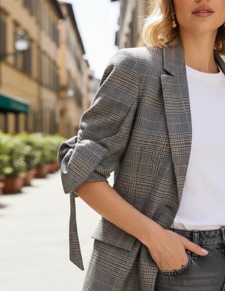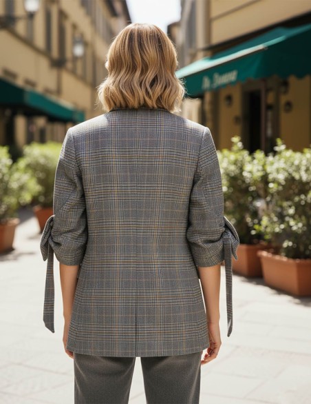 Giacca in tessuto galles monopetto con manica corta arricciata e fiocco, vestibilità regolare
