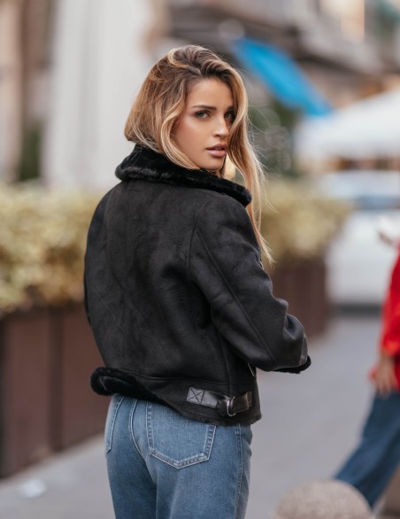 Giacca biker in morbida eco-pelliccia dal design contemporaneo e avvolgente. Dotata di zip metallica asimmetrica e ampio colletto rever, presenta una vestibilità leggermente oversize perfetta per il layering invernale. La texture premium della fodera in faux fur garantisce massimo comfort e calore, mentre i dettagli in similpelle aggiungono un tocco di eleganza urbana.