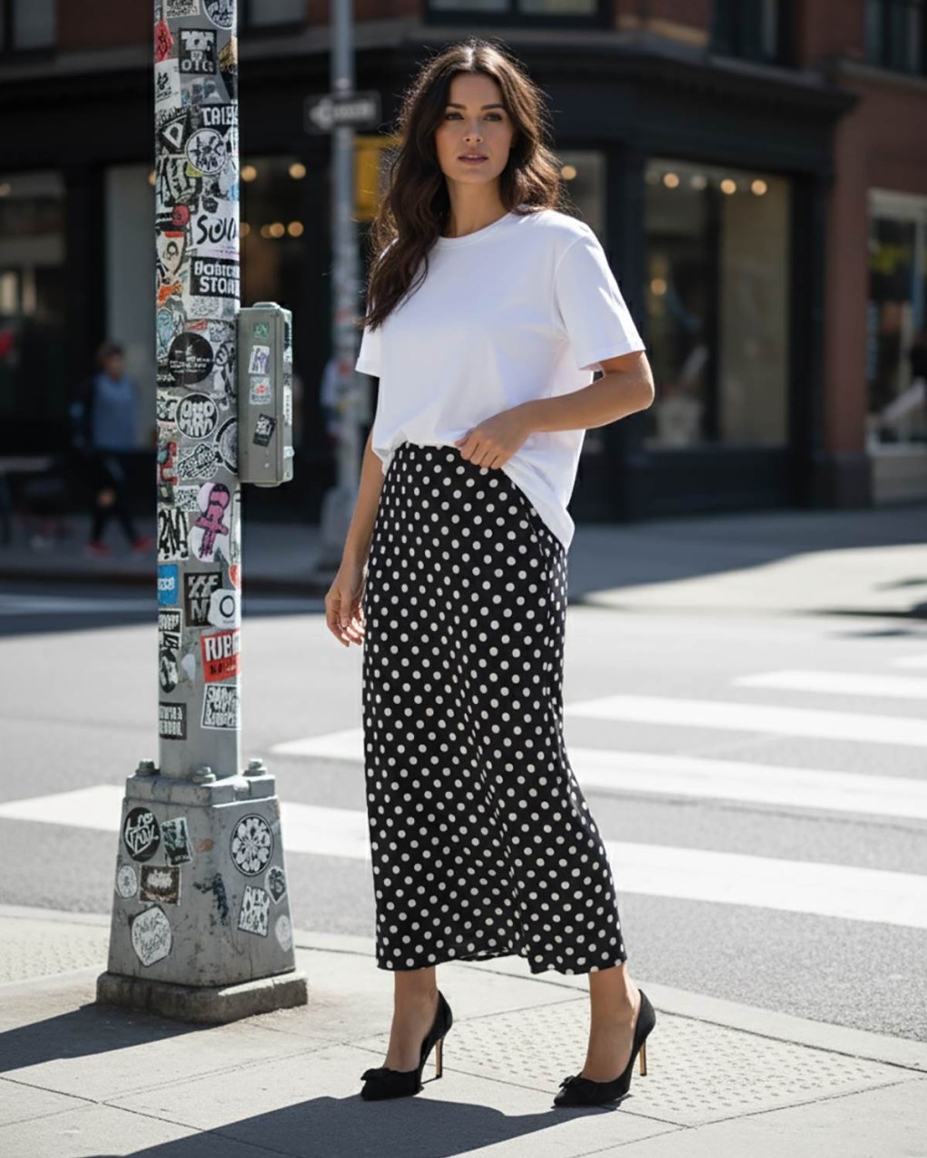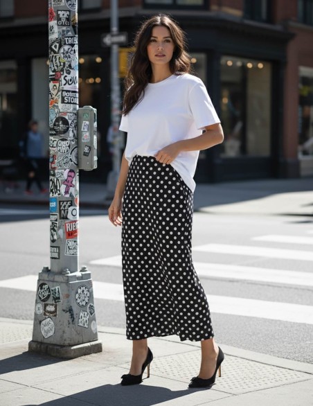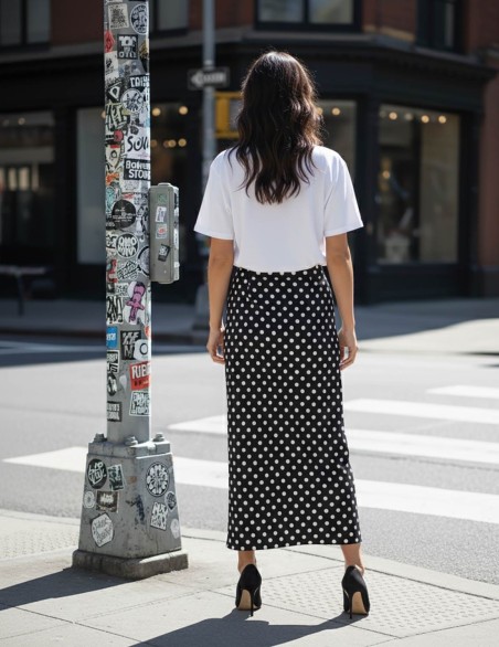 Elegante gonna lunga a pois dal taglio sartoriale, realizzata in morbido tessuto fluido con silhouette aderente che esalta la figura. Il design classico si abbina perfettamente per un look versatile adatto sia all'ufficio che al tempo libero. La sua lunghezza e la vestibilità raffinata garantiscono comfort e stile per tutto il giorno.