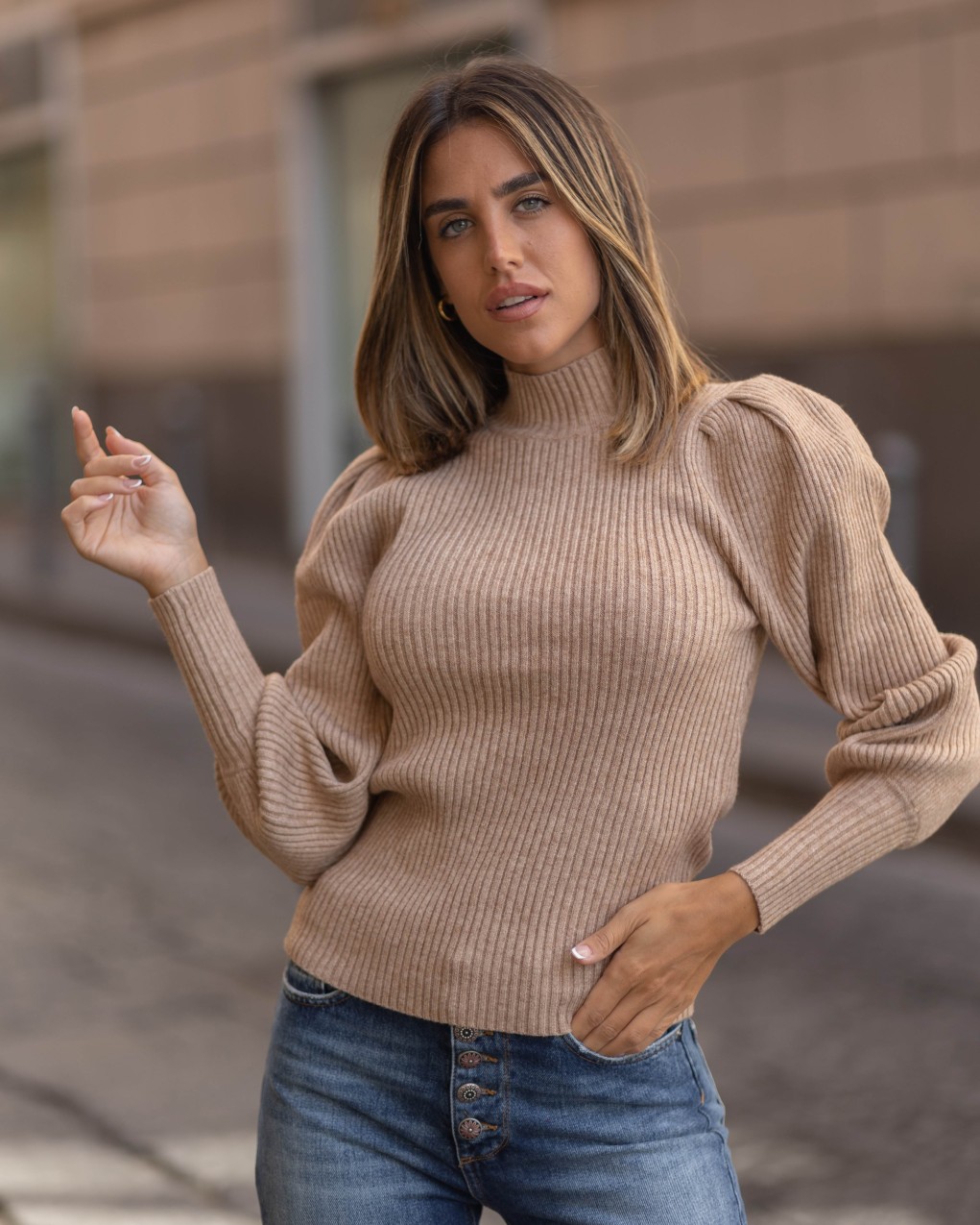 Maglia a costine con collo a lupetto, caratterizzato da maniche a palloncino dal volume ricercato e polsini aderenti. Realizzato in morbida lana, presenta una vestibilità aderente che esalta la silhouette. La lavorazione a coste verticali e il design sofisticato lo rendono perfetto per outfit sia casual che formali.