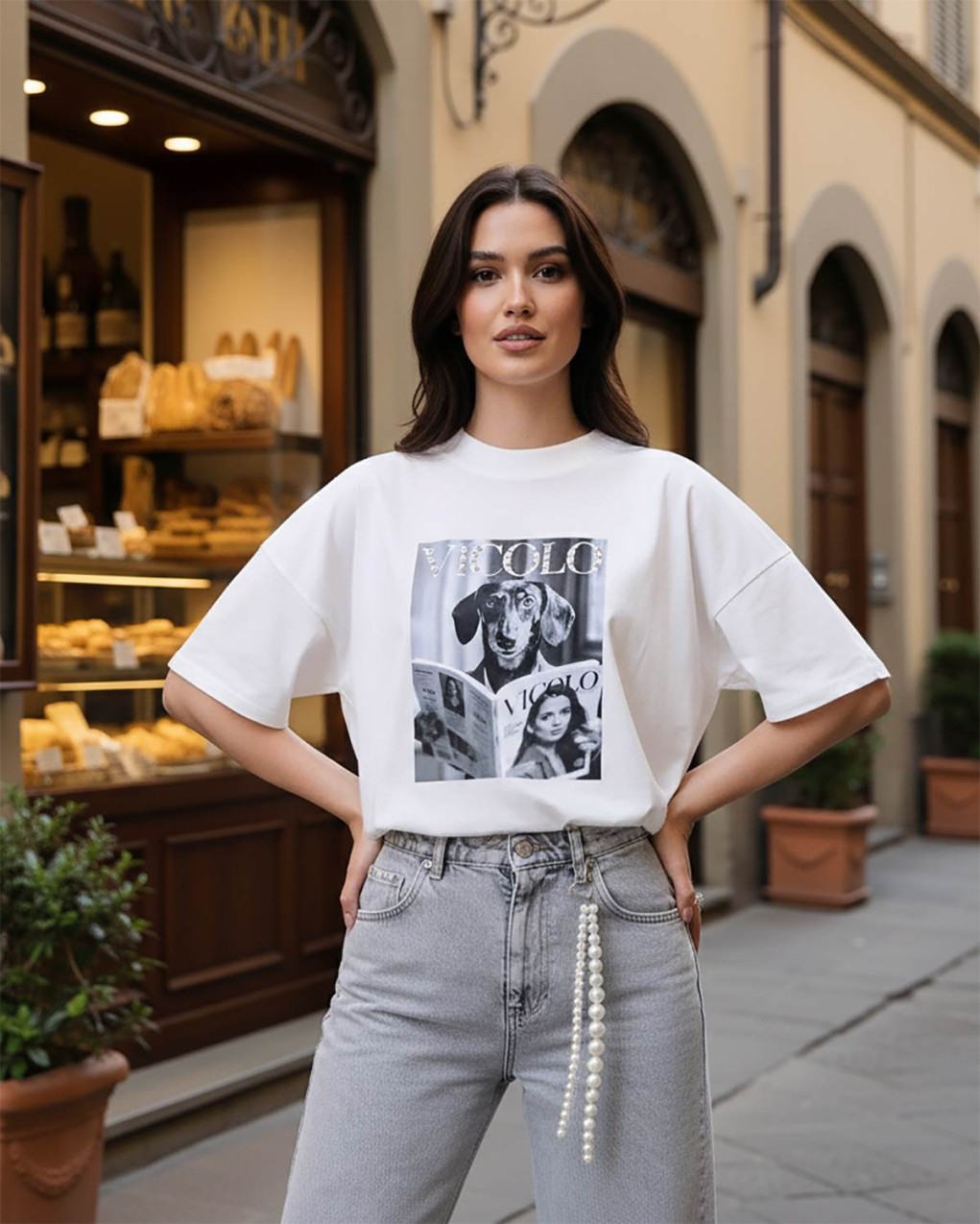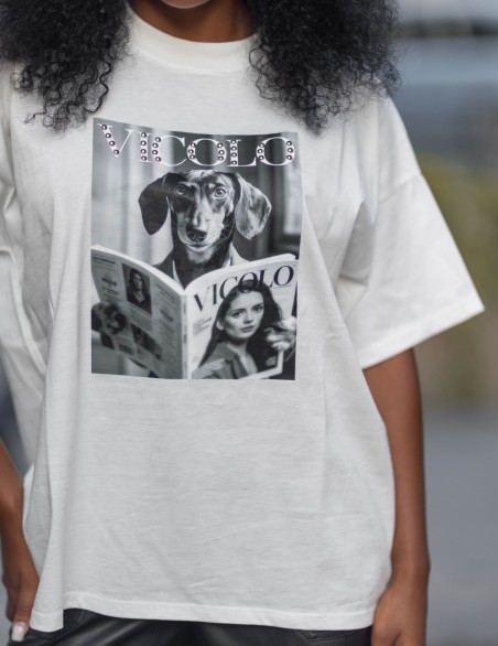 T-shirt in morbido cotone con stampa fotografica di un bassotto che legge una rivista di moda. Design oversize con taglio casual e cuciture rinforzate per una maggiore durabilità. La grafica frontale di alta qualità e il logo con dettagli brillanti aggiungono un tocco di stile contemporaneo del capo.